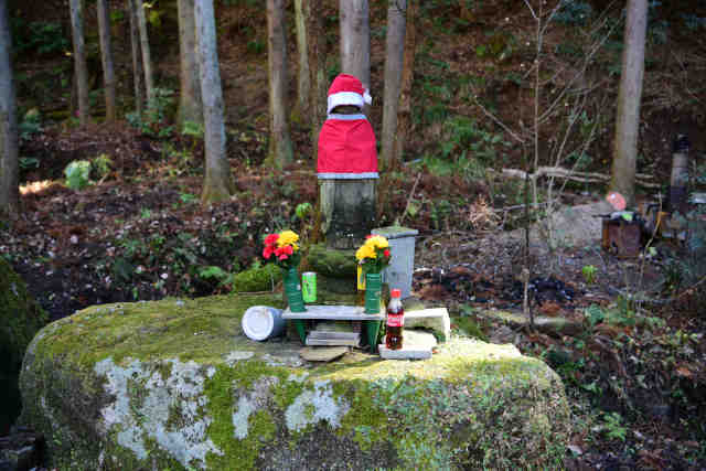 北筑波稜線林道湯袋峠出口(左)、湯袋峠近くに祀られている地蔵尊(右)